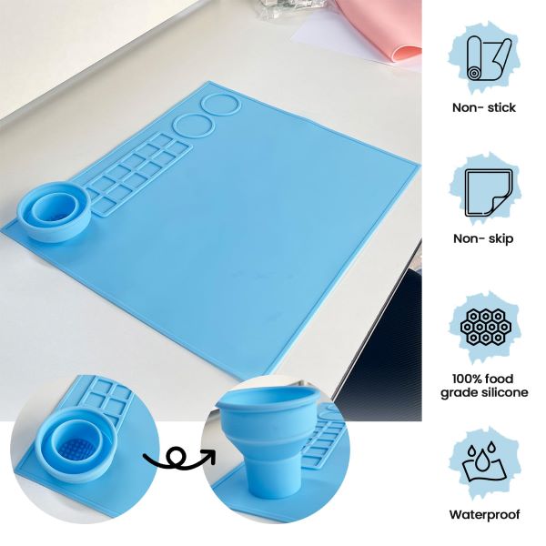 Tato voděodolná, nepřilnavá a protiskluzová podložka je vyrobena ze 100% potravinářského silikonu a je ideální pro všechny vaše řemeslné potřeby. Díky 14 jamkám a míchací ploše je ideální pro organizaci vašich potřeb.